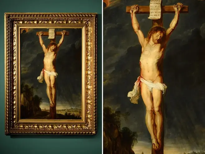 La obra, de 105,5 cm por 72,5 cm, muestra a Cristo crucificado iluminado frente a un cielo oscuro y tormentoso, reflejando el dramatismo barroco característico del pintor flamenco.
