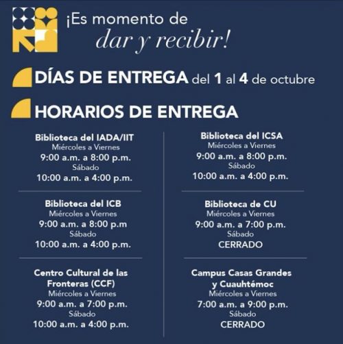 - Sábado 4 de octubre: 10:00 a.m. a 4:00 p.m. (excepto CCU, Casas Grandes y Cuauhtémoc, que permanecerán cerrados).