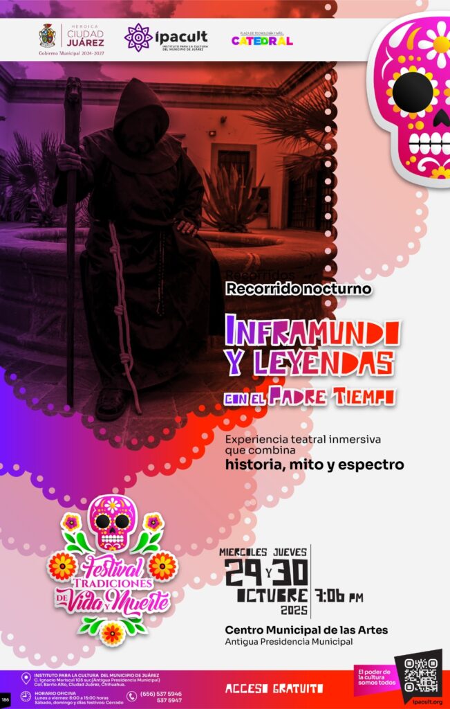 El Instituto para la Cultura del Municipio de Juárez (IPACULT) invita a la comunidad juarense a sumergirse en una experiencia única con el recorrido gratuito “Inframundo y Leyendas”, que se llevará a cabo los días 29 y 30 de octubre a las 7:06 de la tarde en la antigua Presidencia Municipal, como parte de las actividades del Festival Tradiciones de Vida y Muerte.