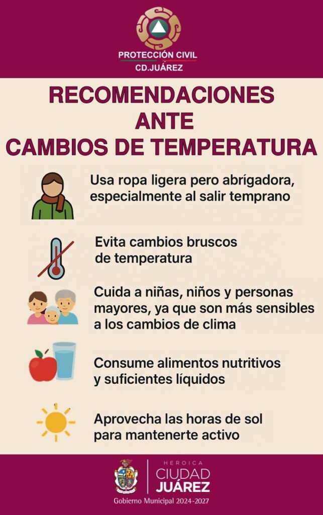 La dependencia recomendó a la población evitar cambios bruscos de temperatura, usar ropa ligera pero abrigadora, cuidar especialmente a niñas, niños y personas mayores, y mantener una alimentación nutritiva e hidratación adecuada.